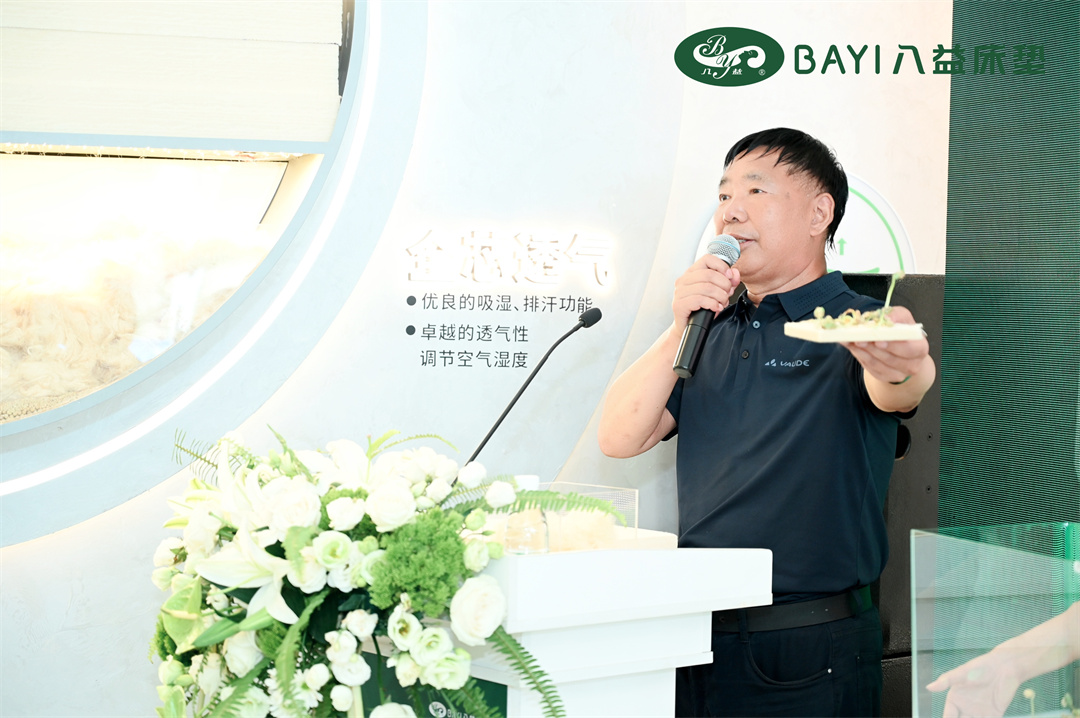 现场王总向来宾展示了大豆蛋白纤维床垫从大豆-豆粕-豆丝-高温物理一体成垫是如何合成的,并表示大豆蛋白纤维是一个非常健康环保的材料。八益在接下来还会推出大豆蛋白纤维的全系列产品,包括生产婴儿垫,学生垫等产品,八益床垫也将在未来持续不断的为消费者提供更多优质和健康的产品。