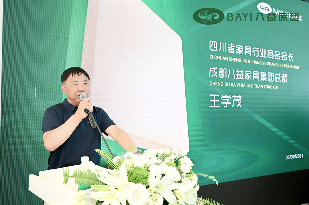 会议开始,八益集团总裁王学茂先生进行了精彩的开场致辞,对到场的各位来宾表示了热烈的欢迎,对于即将来临的建党百年大庆,也表达了由衷的祝贺。八益床垫坚持走到今天36个年头,离不开消费者对八益的热爱和信赖。随着人们生活水平的提高,科技的进步,社会的发展,在党的领导下全中国人民不断迈向新的时代,八益床垫也开始了新的征程。研究并开发出了健康环保的大豆蛋白纤维床垫。