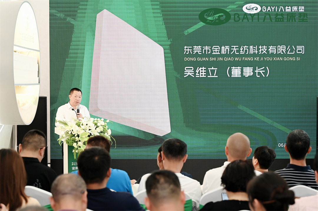 吴维立董事长在会上对大豆蛋白纤维床垫内芯生产技术进行了详细的描述,在生产过程中,使用国内独有的专利技术和工艺,整个过程健康,环保 ,无污染,最大限度杜绝了甲醛等有毒物质的存在,最后吴维立董事长对国人睡眠问题表现出了他的殷切期望,希望国人能够拥有一个健康的睡眠环境和一个健康的体魄。