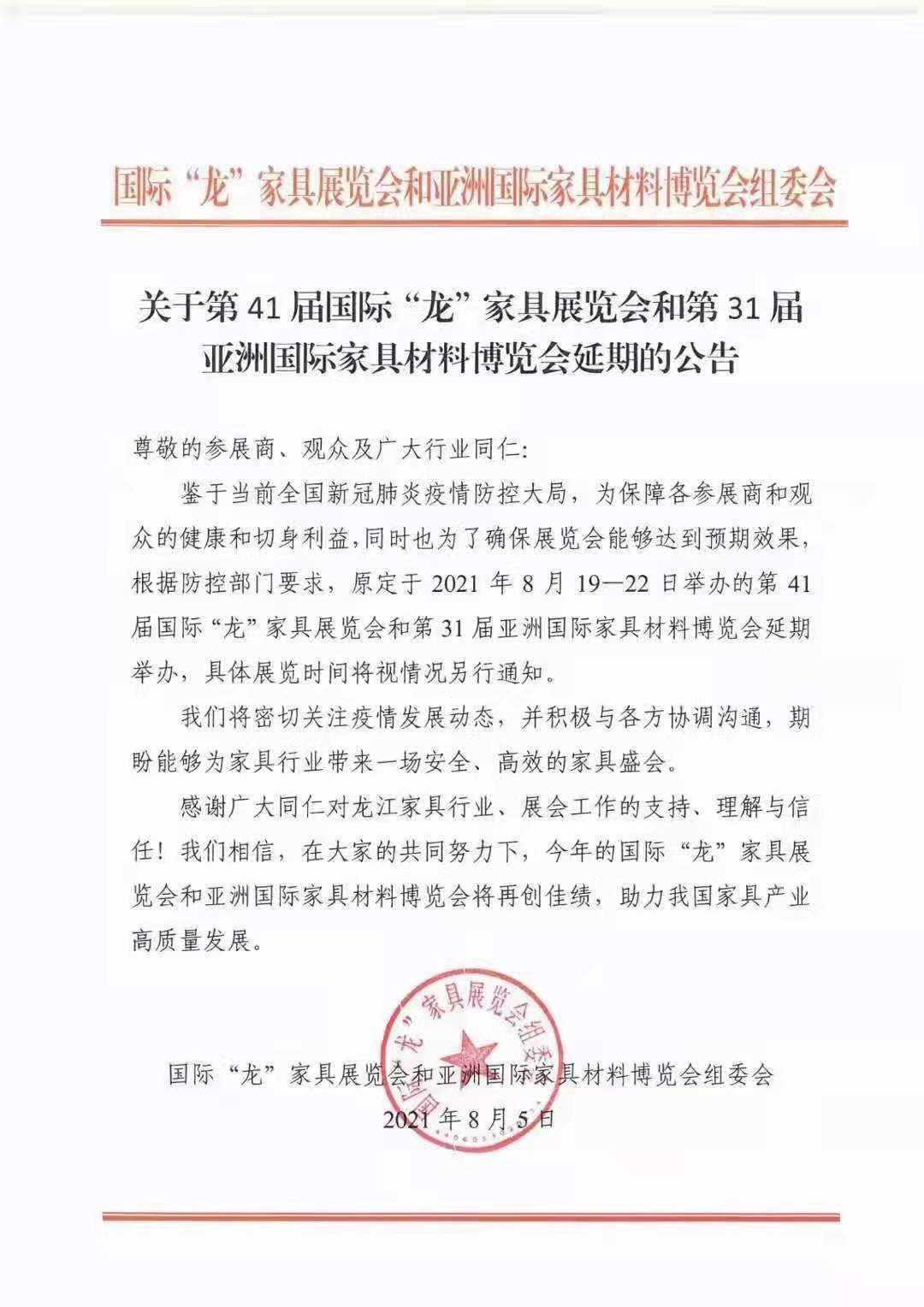 第41届国际“龙”家具展览会和第31届亚洲国际家具材料博览会延期! 日期:2021-08-09 栏目:今日头条 浏览:次 上一篇:为定制家居企业实现制造升级,造易软件助力行业迈向新未来! 下一篇:第48届中国家博会(上海) 延期举办 内容版权声明:除非注明,否则皆为本站原创文章。 转载注明出处:http://www.jiajuzhuliu.com/article/toutiao/1079.html 相关推荐 2026-01-23150天后,来「北京家居设计周」赴一场空 2026-01-222WMF2026定档9月5–8日:以“智造新平衡·木 2026-01-183阳光林森2026“定制+成品+同城营销”新战 2026-01-174得一家居2026商务峰会圆满举办,破局存量 2026-01-075好风景2026营销战略发布会暨新品盛典圆满