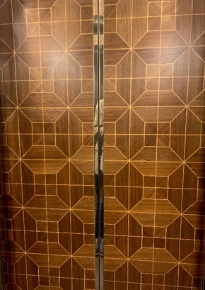 (客房电梯由美国胡桃木木皮拼成几何图形)