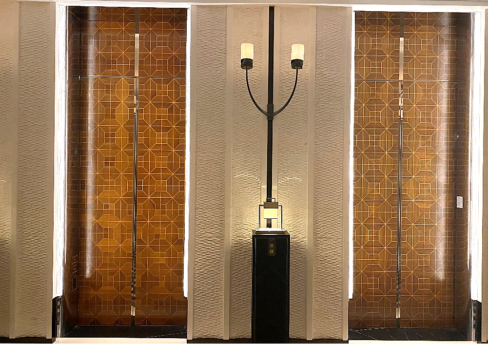 (香港瑰丽客房电梯由美国黑胡桃木拼成几何图形)