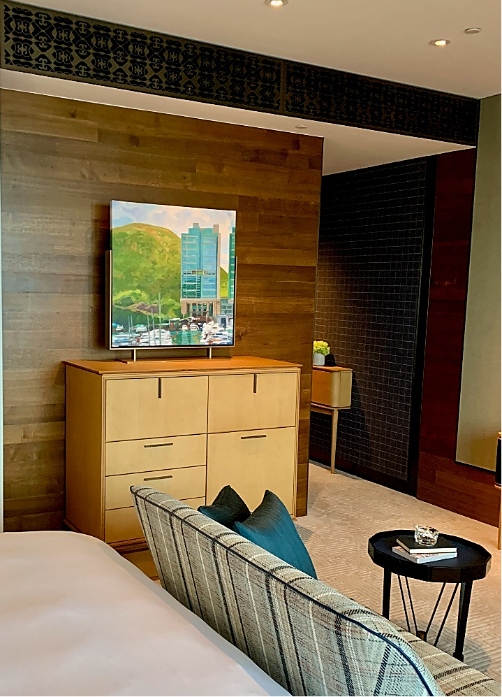 (采用美国黑胡桃木打造的香港瑰丽客房墙面内饰)