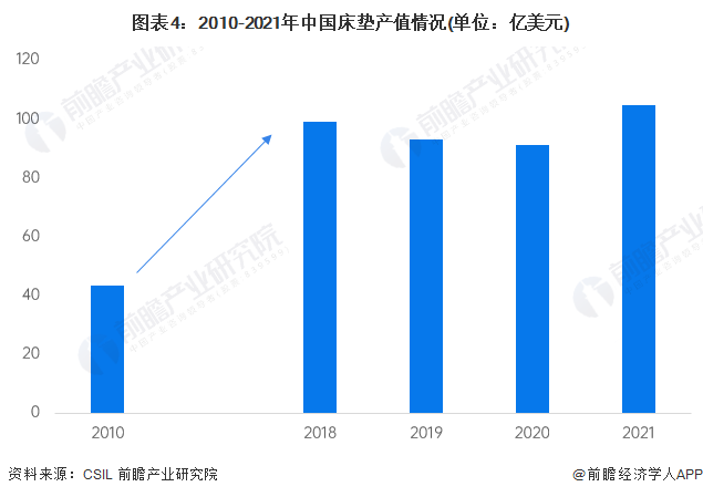 2019年,我国床垫总产值约93亿美元。2020年,我国床垫总产值持续小幅下滑至约91亿美元。前瞻初步估算,到2021年,我国床垫总产值回升至约105亿美元。
