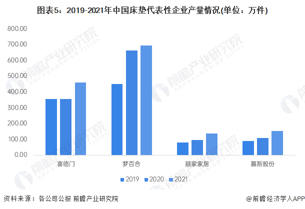 2019-2021年我国床垫行业代表性企业床垫产量总体呈上升趋势。2021年喜临门床垫产量458.68万件,同比增长29.27%;梦百合床垫产量695.34万件,同比增长4.99%;顾家家居床垫产量137.44万件,同比增长44.31%;慕思股份床垫产量153.92万件,同比增长43.46%。综合来看,2021年梦百合床垫产量在上述四家代表性企业中最大,喜临门床垫产量增速最快。