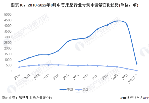 从趋势上看,2010-2013年,中美国床垫专利申请数量均保持较为平稳的增长水平,但是在2014年后中国床垫专利申请数量增长势头强劲,大大拉开了与美国之间的差距。2021年,中国床垫专利申请量为4089项,美国床垫专利申请量下降至209项。