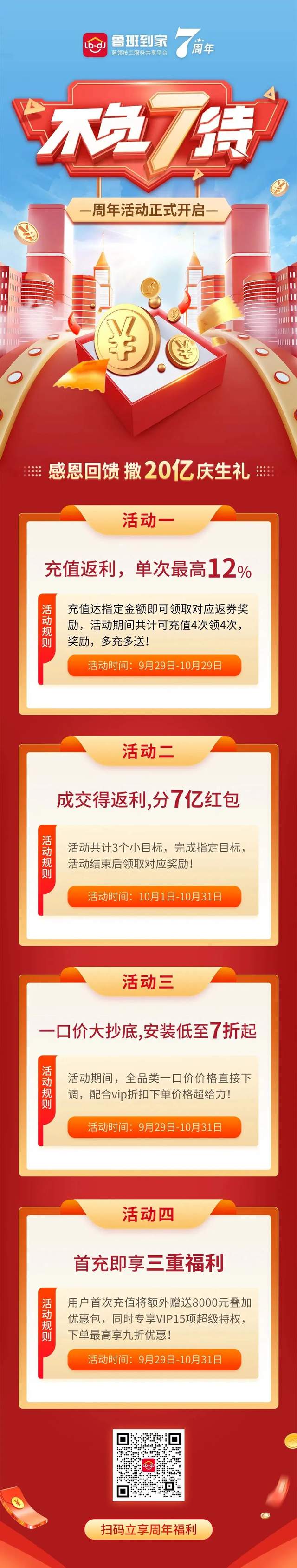 鲁班到家不仅在蓝领师傅领域活动中投入力量,而且在本月的鲁班到家七周年之际,更是推出了惠及150万家居企业的“不负7待”周年活动,感恩回馈,狂撒20亿庆生礼。