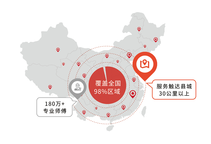 目前鲁班到家在全国的师傅,服务已可覆盖全国32个省、600多个城市、2800个区县、40000多个街道、综合覆盖率达到98%,服务轻松触达县城30公里以上。
