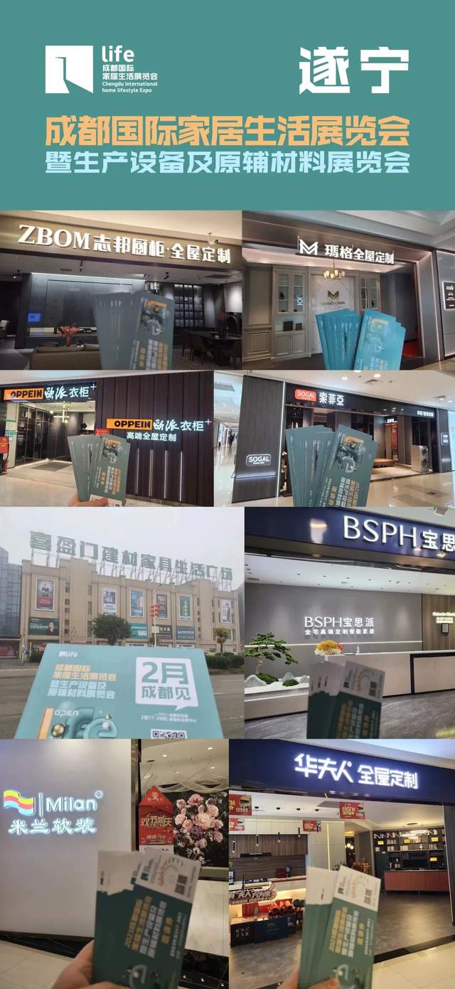 在遂宁喜盈门建材家具生活广场,地推团队成员先后拜访了场内的玛格全屋定制、华夫人全屋定制、米兰软装、索菲亚、宝思、欧派、志邦等多家家居门店,就展会的规模、亮点、时间地点、注意事项等情况进行了详细介绍,众多场内经销商对2月成都展会充满无限期待,纷纷表示届时将前往成都观展、学习、采购。