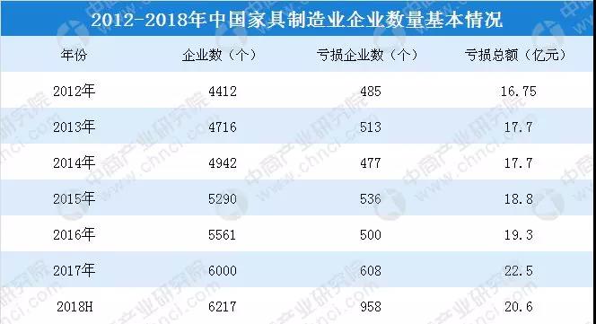 到2018上半年全国家具制造业企业数量已经增长至6217家,其中亏损958家,亏损面为15.4%,亏损总额达20.6亿元。