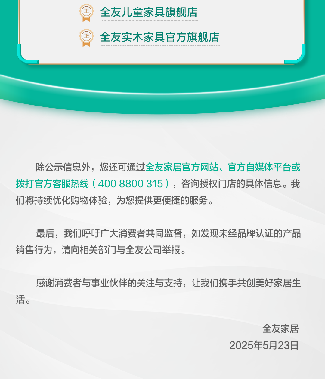 为此,全友家居发布郑重声明,全友家居将坚守对消费者的承诺,营造健康、可靠的消费环境。持续强化品牌保护与市场监管力度,以零容忍的态度打击侵权与假冒行为。未经全友家居品牌授权认证的门店所售的非官方产品,全友家居将不提供任何售后服务保障。因此,我们诚恳地提醒广大消费者,在选购产品时,务必仔细甄别,认准官方渠道与正规门店。