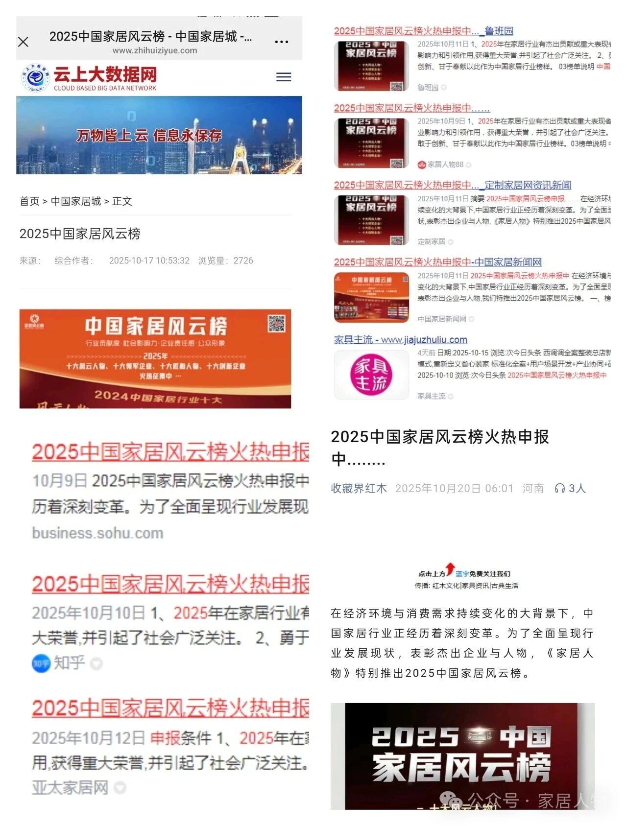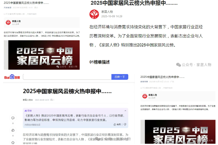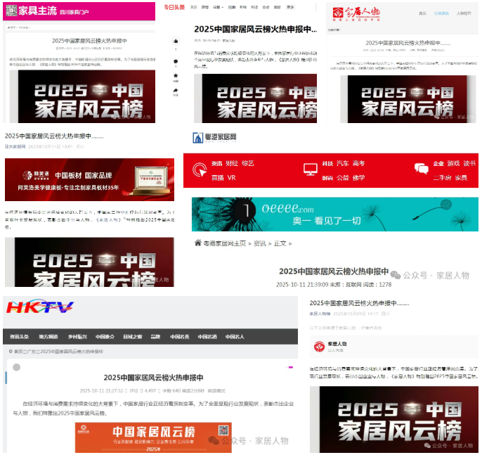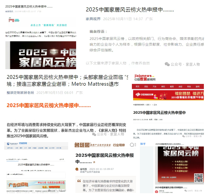 申报信息的传播热潮中,行业媒体的集体参与成为重要推手。《亚太家居网》、《家具主流》、 《家居周讯》、《鲁班园》、《家商传媒》、《家具视界》、《门业视界》、《定制家居网》、《整家定制家居老段》、《收藏界红木》、《云上大数据网》、《天府家居》、《家居人物榜》、《知乎》、《百度》、《今日头条》、《搜狐》、《粤港家居网》、《中国家居新闻网》、《香港卫视数字平台》、《家居人物网》等纷纷转发报道。抖音、视频号、快手、小红书、B站等等社交平台上,#2025家居风云榜申报#话题快速升温。