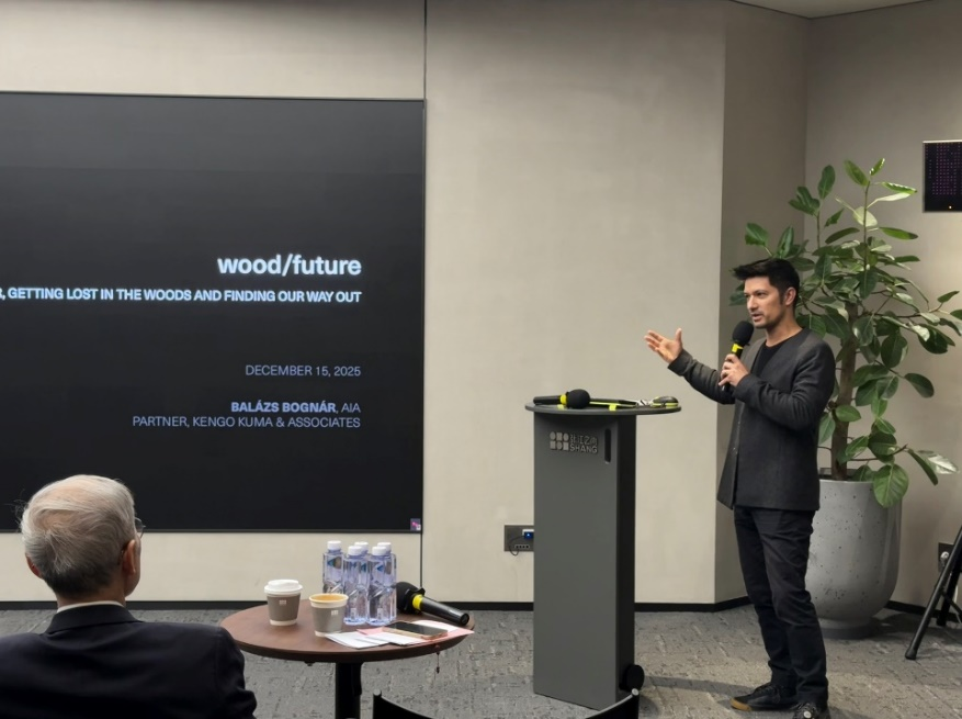 作为研讨会特邀演讲嘉宾,建筑师巴拉兹·博格纳(Balazs Bogner)生动展示了从树林到建筑的诗意表达。他以“木材:时间、地域与叙事的载体”为主题,通过多个实际案例,诠释了如何将美国橡木、竹材等天然材料与混凝土、钢材进行创新结合,并深入解析了木材在不同文化语境中的象征意义与空间叙事潜力。