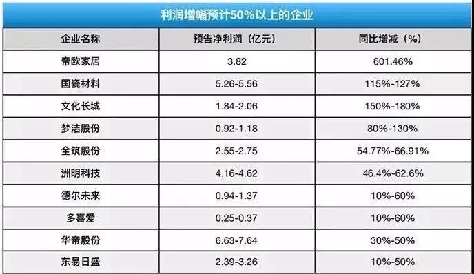 预计增幅超过100%的企业表示,超额增长与业务的拓展、企业重组并购等动作密切相关:帝欧家居通过并购佛山欧神诺陶瓷有限公司,实现601.46%的增幅;文化长城因并购翡翠教育业绩同期增长,国瓷材料因子公司王子制陶、深圳爱尔创、江苏金盛业绩纳入财报,实现增长;而梦洁股份通过市场拓展和终端零售改造,在2018年取得了巨大成效。