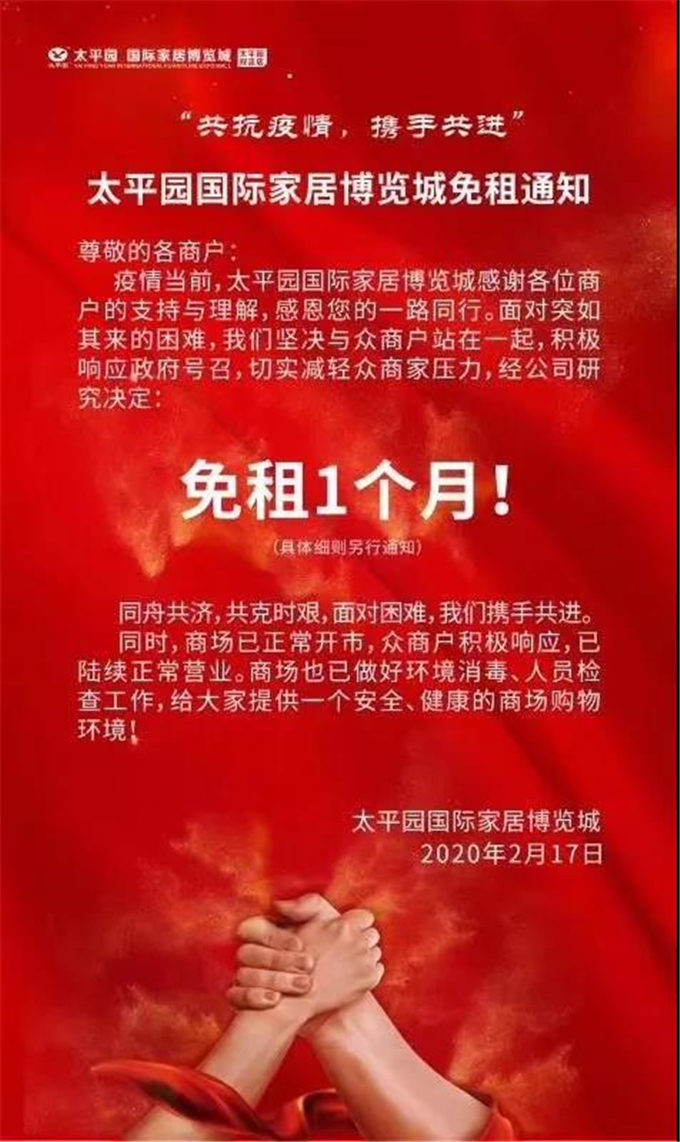 为了助力打赢这场疫情防控战,太平园还成立疫情防控工作领导小组,对日常消杀、员工体温检测、作业防护等多个方面作了精细化规定。前期还发布《告商家、营业员倡议书》《太平园复工工作计划》等,明确企业应急管理规定,强化员工和商家疫情防控教育,要求全体人员自觉接受、积极配合疫情防控各项管理。