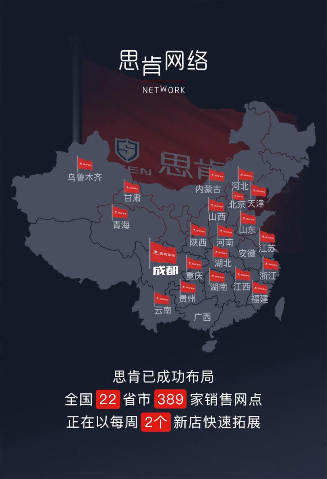 思肯家居出口转内销,自2015年开始全面征战国内市场,立足二三线城市快速织网布阵,终端霸气展现,全力升级卖点为王模式,用品质征服了国内市场。截止目前,思肯家居已在全国22个省市建立销售网点389家,并以每周2个新店的速度快速拓展扩张销售网络版图。