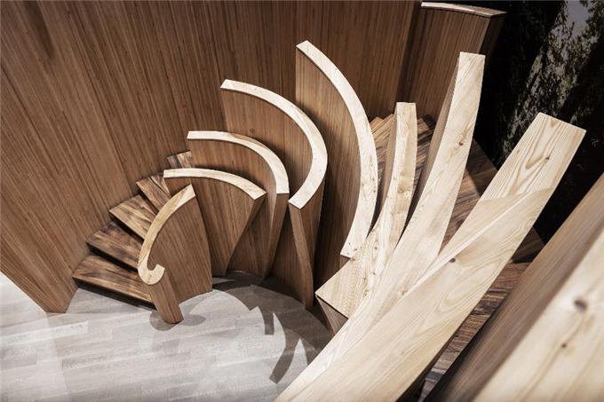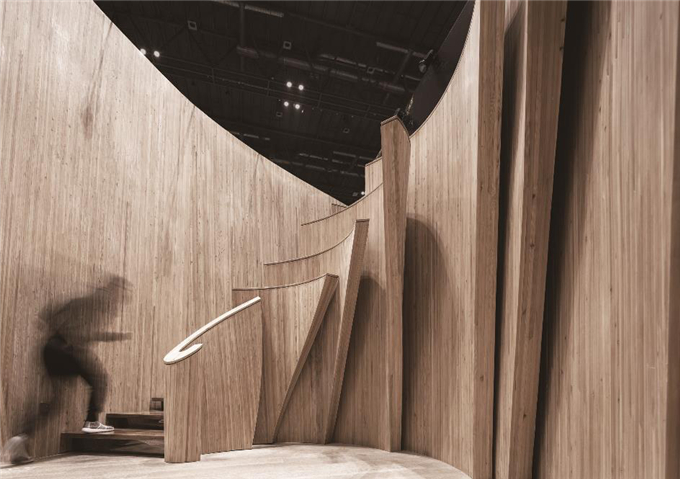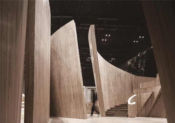 在去年的中国家具博览会上,杜柏均使用美国红橡和白橡打造了惊艳的全木制展厅,木材的可塑性被展现得淋漓尽致。