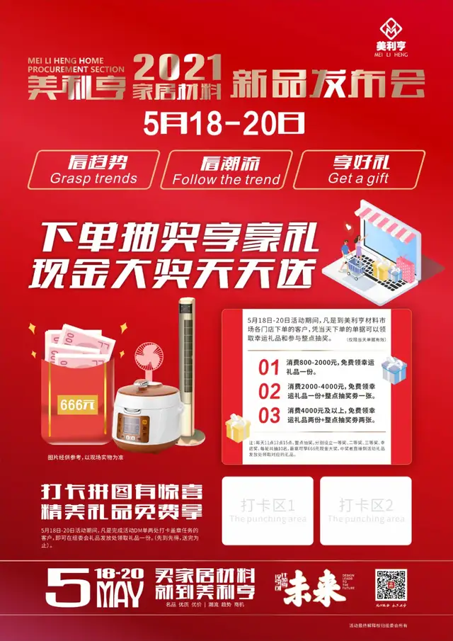5月18日-20日期间,凡是到美利亨材料市场完成活动DM单,两处打卡盖章任务的客户,即可在组委会礼品发放处领取礼品一份。(先到先得,送完为止)